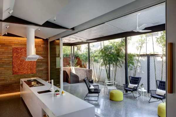 Закрытых вариантов летней кухни много. Иногда под нее отводят веранду дома или делают специальную пристройку. Чаще всего под летнюю кухню строится отдельное помещение. Это может быть стеклянный домик с окнами в пол, летом они полностью раздвигаются.