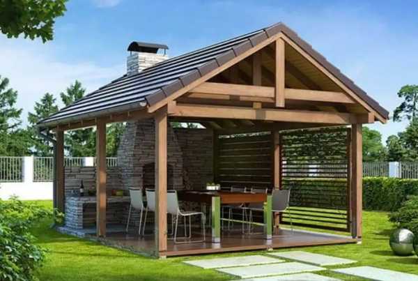 Они могут быть закрытые и открытые. Вторые проще и дешевле, но их нельзя использовать зимой. Построить такую кухню просто – обычно это беседка, в которой помещается стол, лавки и очаг, на котором готовится еда.