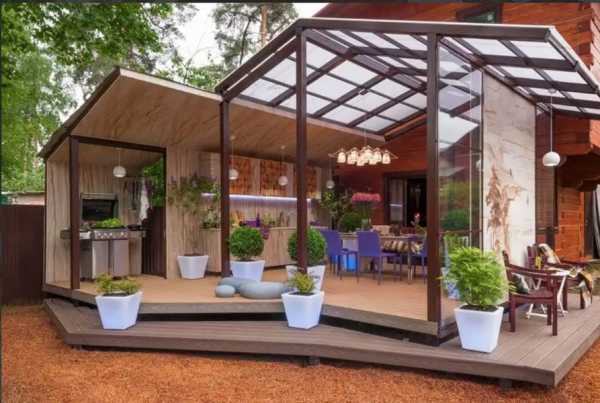 - Терраса или веранда. Размещение на территории, пресмыкающейся одной стеной к дому очень выгодно. У человека не возникнут проблемы с проведением коммуникаций и электроэнергией.