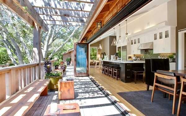 Многие домовладельцы используют для летней кухни веранду открытого типа – это экономный вариант, который не требует проведения капитальных строительных работ. При этом открытую часть веранды остекляют, устанавливая входную дверь для комфортного перемещения.