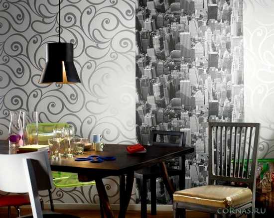 Сегодня очень модно комбинировать обои, ведь это не только стильно, но и позволяет произвести зонирование помещения. Так на кухне выделяют зону где стоит обеденный стол, стена в этом участке оклеивается более темными или светлыми обоями — создается контрастная полоса. А может применяться прием с который подразумевает использование такого же цвета обои, но с другим орнаментом.