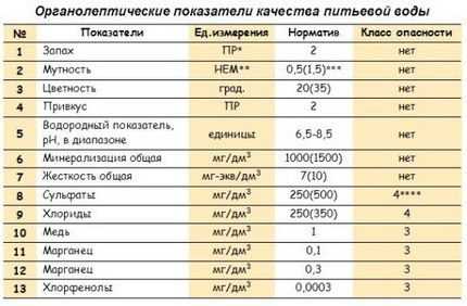 Органолептические качества питьевой воды из колодца с указанием допустимых параметров будут сведены в общую таблицу