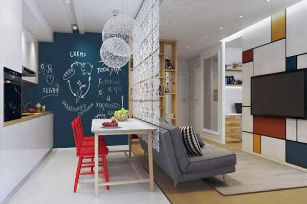 Если вы не собираетесь устраивать перепланировку квартиры, которую обязательно нужно предварительно согласовать. то кухню и ванную придется размещать там, где проходят коммуникации. Но вы можете использовать мебель, как своеобразный «разделитель» для зонирования пространства. Так, например, стеллаж с книгами отлично заменит стену. За ним можно спрятать рабочее место или кровать.