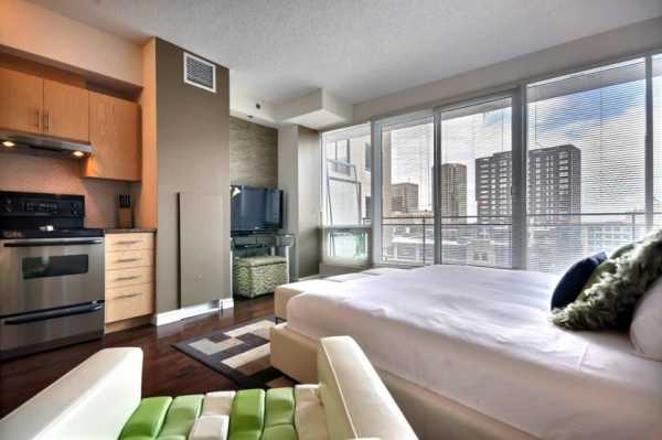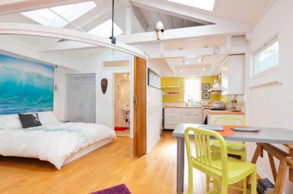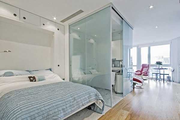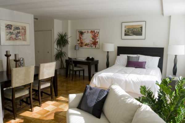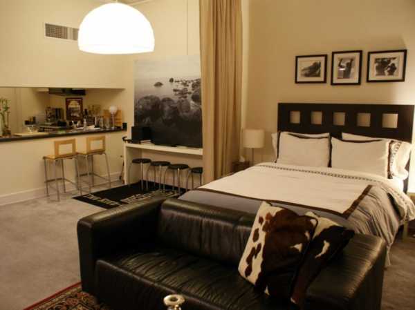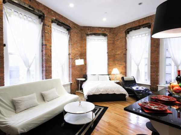 Но это пространство, однако, необходимо зонировать. чтобы сразу было понятно, где кухня, а где спальное место. Также вам нужно будет позаботиться о хорошей вытяжке, поскольку запахи с кухни будут разноситься по всей квартире. Постарайтесь сделать спальную зону как можно дальше от кухни. Так же следует поступить с рабочим столом. Не стоит перегружать студию мебелью. Лучше использовать один большой и вместительный шкаф, чем несколько маленьких. Разместить в студии полноценную кровать скорее всего не получится, поскольку размеры квартиры слишком малы. А вот диван, трансформирующийся в кровать, — отличный вариант для квартиры с небольшой площадью. Он будет выполнять функции спальной зоны и гостиной.