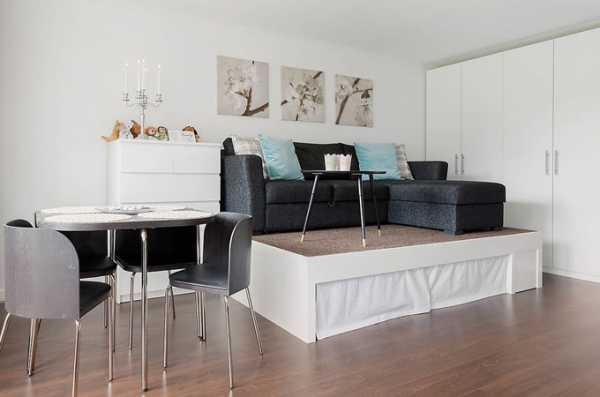 В планировке однокомнатной квартиры 40 кв м вполне можно прибегнуть к обустройству подиумов. Уровневым зонированием может быть выделена обеденная зона. Неплохо будет смотреться на возвышении диван. Сам подиум, при рациональном использовании пространства, тоже не остается пустым, в нем организуют зоны хранения.