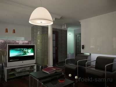 В общей части, при открытой планировке, размещается небольшой диванчик, книжный стеллаж, телевизор и журнальный столик. Площадь кухни комплектуется П-образно расположенными столешницами, с обязательным включением в рабочую зону подоконника, и довольно большим, рассчитанным на шесть персон, обеденным столом. Положительным моментом такой свободной планировки является возможность беспрепятственно перемещать предметы обстановки кухни и гостиной, что позволит создавать различные композиции, актуальные текущему моменту.