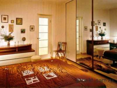 Вместительный шкаф-купе лучше вынести к входной двери. Таким образом, появится отличная, не загромождающая основное помещение, система хранения. Как будет в общем смотреться подобная планировка однокомнатной квартиры, ищите на фото.
