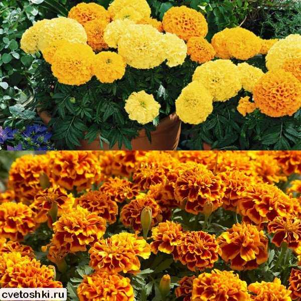Бархатцы подразделяются на низкорослые и высокорослые сорта. Первая группа может использоваться для озеленения балконов и лоджий. Высокие кустики прекрасно смотрятся на клумбах, вдоль заборов и фасадов домов.