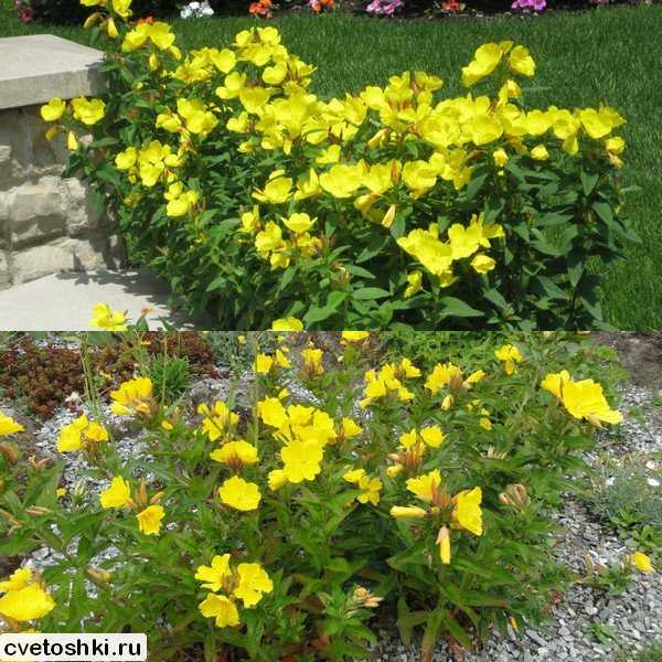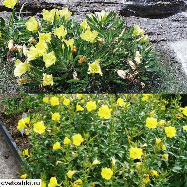 Энотера является довольно редкой культурой, мало кто знает, что она прекрасно подходит для альпийских горок. Выносит как палящий солнцепек, так и длительное затенение. Невысокие стебельки высотой до 40 см богато покрыты мелкими желтыми солнышками цветочков.