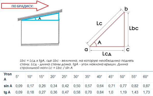 - Угол между скатом и основанием крыши определяют по формуле A = Lbc / Lc, где Lbc – разница между высотой опорных стоек крыши, а Lc – длина стропильной ноги.