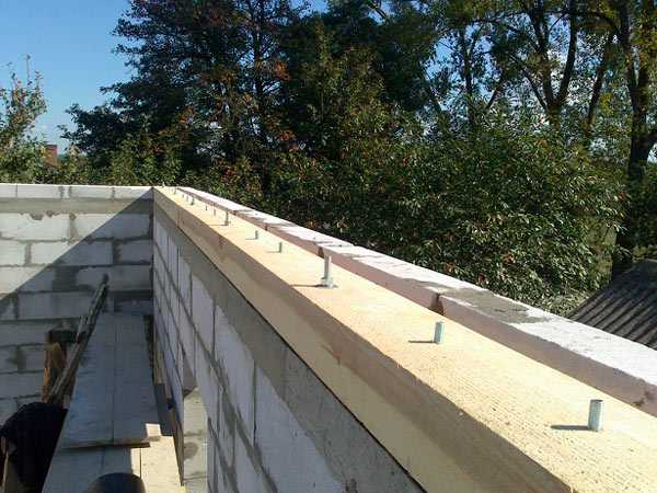 Иногда необходим армированный пояс под мауэрлат, в который вставляют стальные шпильки и уже на них надевают сам брус. Зачем это нужно? Чтобы не только распределить нагрузки от крыши, но и достичь максимальной горизонтальности. Иначе у вас с одной стороны односкатной крыши получится один угол наклона, а со второй – другой. Поэтому наличие мауэрлата – обязательное условие.