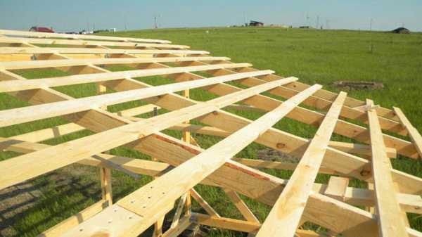 Итак, все готово, можно переходить к монтажу стропильных ног. Их укладывают на мауэрлат так, чтобы края стропил выходили за края стен приблизительно на полметра. Нередко от такой конструкции отказываются в пользу укороченного варианта. То есть, стропилы за стены не выводятся. Причина – снижение нагрузок на крышу при сильных порывах ветра, потому что выведенный участок, как парус, может стать плоскостью давления. Правда, сами стены остаются без защиты от дождя и снега, поэтому нужно их закрыть или кладкой стенового материала, или листами железа, придав им фасонную форму.