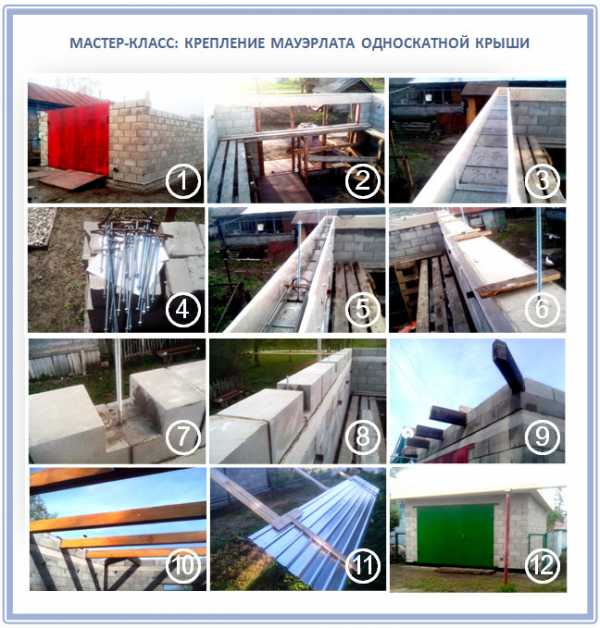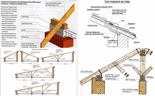 Теперь, после того как бетонный пояс подсох, на него укладывается мауэрлат. Это, по сути, обычный деревянный брус, который крепится к стенам дома. Поэтому еще на стадии заливки бетонного раствора в армирующий пояс вставляются закладные в виде шпилек или анкеров из металлического прута или арматуры. Если скат крыши достаточно длинный, то лучше своими руками укрепить стропильную систему дополнительными деревянными опорами. Посмотрите на фото ниже, здесь как раз такая односкатная конструкция показана.