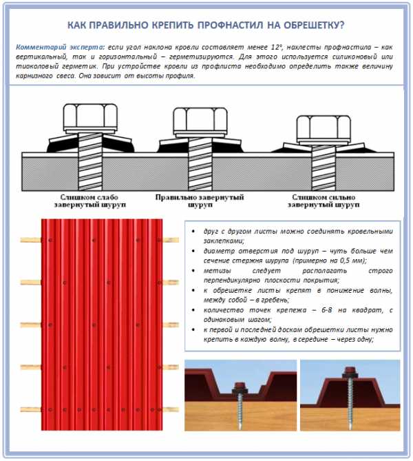 Есть несколько момент, на которые необходимо обратить внимание, скрепляя профнастил с элементами обрешетки крыши.
