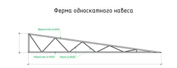 У навесов с одним скатом фермы расположены с краю строения и в середине непосредственно под кровельным материалом. Чаще всего фермы делают из круглой профильной трубы, диаметр которой составляет 30 см. Также может использоваться квадратная профильная труба сечением 30*30 см. Для создания угла фермы верхнюю трубу берут немного длиннее, чем нижнюю. Распорки между ними стыкуют под углом около 25 градусов и устанавливают в виде зигзага. Непосредственно на фермах крепят элементы обрешетки.