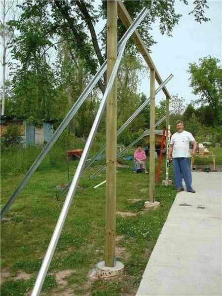 Итак, разместите угловые точки будущего навеса прямо на земле. Для удобства используйте два кола, которые соединены между собой рейкой. Всего таких вам понадобится около 10 штук, и они и помогут вам заложить верную разметку будущего навеса.