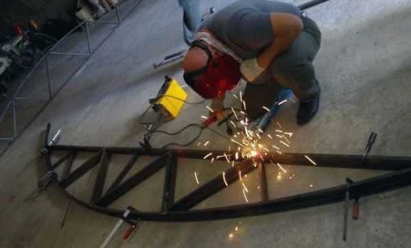 После началось изготовление ферм. Сначала на трубогибе выгнули профили с требуемым радиусом (подъем в высшейточке 1,2 м). После началась сборка «конструктора».