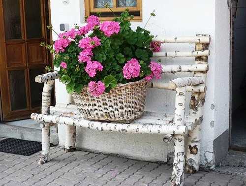 — Соорудите небольшое кресло из высушенных веток березы и поставьте на него корзину из живых цветов.