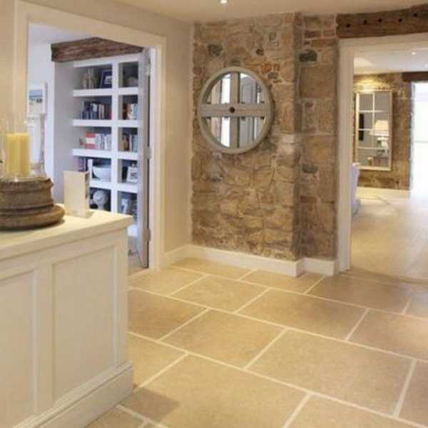 - Пол из натурального грубого камня выгодно смотрится на фоне белого цвета, пастельных естественных оттенков. Отлично впишется в стили прованс, деревенская классика.