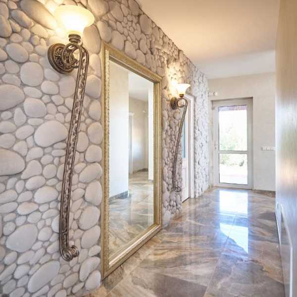 - Мелкие детали каменной отделки в светлых тонах подойдут для фона больших объемных декоративных зеркал, тарелок или картин.