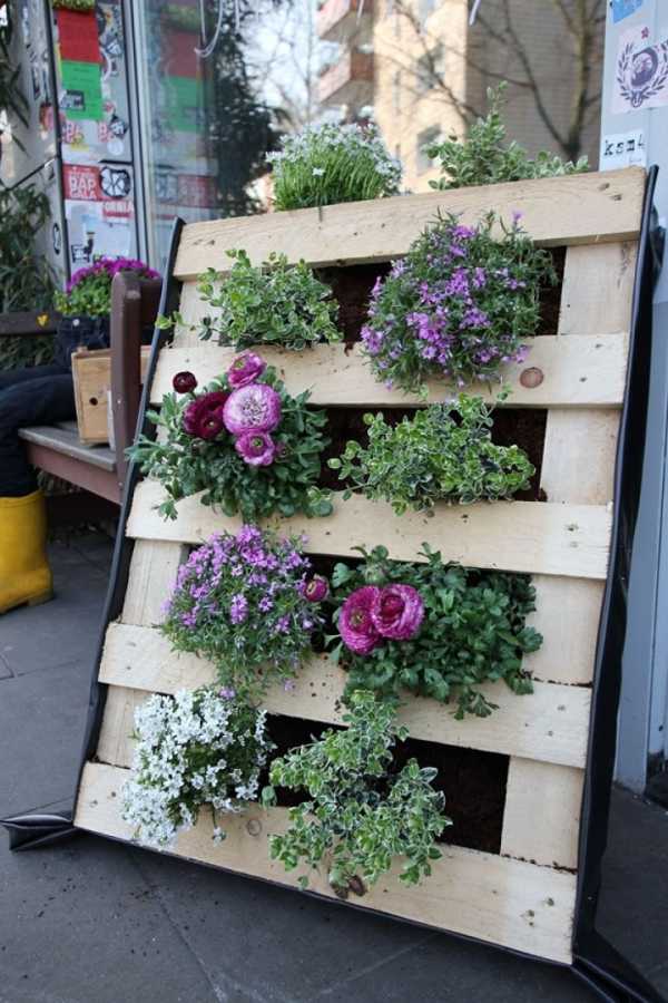Красивая идея вертикальной клумбы из деревянной ячеистой основы с землей. Идея несколько сложная и, возможно, недолговечная. Однако, почему бы и нет?
