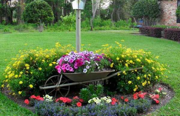 Симпатичное решение — клумба акцент с элементами декора: тачкой и фонарем. Даже самые простые цветы в этой композиции смотрятся эффектно.