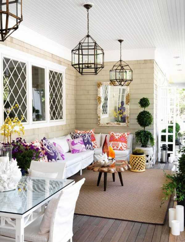 Часто здесь устанавливают компактное место для отдыха – стол со стульями или небольшое кресло, дополняют пространство зеленью. Такое решение отлично смотрится в стиле кантри, прованс или в сочетании с эко-стилем. Также стоит рассмотреть вариант скандинавского или восточного стиля.