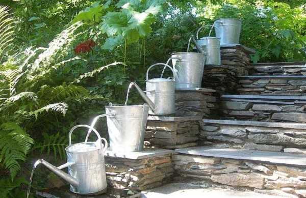 Водопад по ступенькам, только в непривычном исполнении: фонтан из леек и ведер