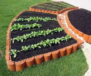 Если ландшафтный дизайн огорода включает элементы с плавными изгибами, окружностями и кривыми линиями, фигурное обрамление для овощных грядок можно выполнить из готовых модулей.