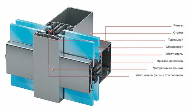 Несущий каркас конструкции образуют вертикальные стойки и установленные на них горизонтальные ригели. Главные составные элементы и дали название данному виду крепления. Ограждающий материал устанавливается в полученную конструкцию при помощи уплотнителей из резины и закрепляется штапиком.