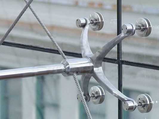 Особенностью системы является крепление ограждающего материала при помощи «спайдеров» – специальные высокопрочные кронштейны из легированной стали, чем-то напоминающие пауков, название которых на английском языке и дало имя всей системе витражного остекления.
