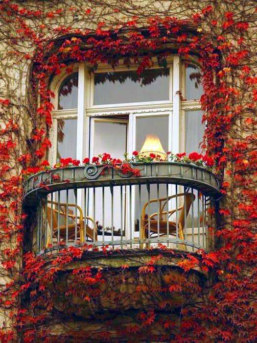 Потрясающий балкончик в окружении красного плюща. Париж, Франция.