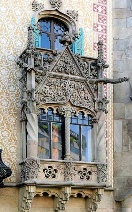 Причудливое окно в нише, украшенной каменной мозаикой. Дом Фигерас (Casa Figueras), Барселона, Испания.