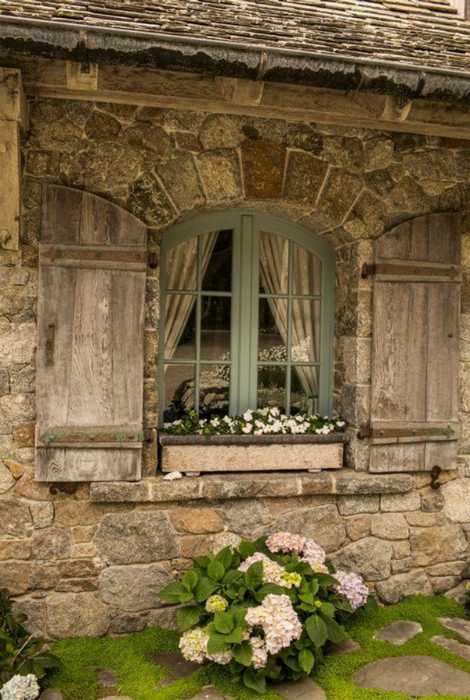 Винтажное окошко с деревянными ставнями. Нормандия, Франция.