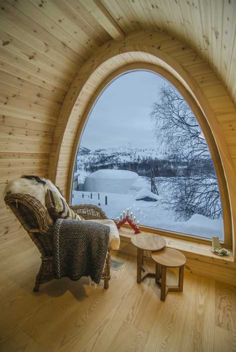 Большое полукруглое окно, которое позволяет беспрепятственно любоваться заснеженными пейзажами. Норвегия.
