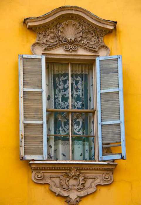 Окно в раме, стилизованной под золото, украшенное лепниной. Парма, Италия.
