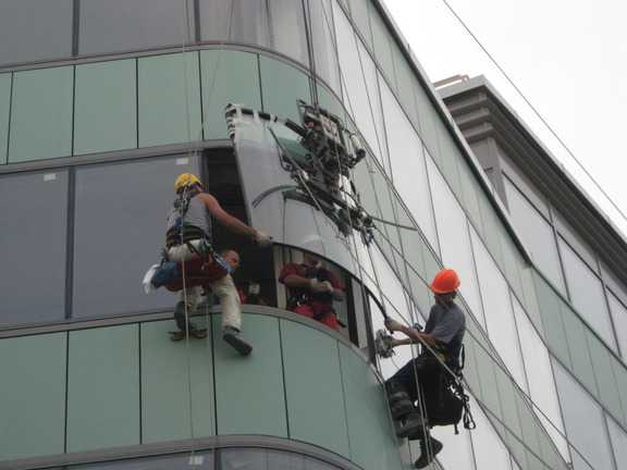 - сложность мытья фасада с внешней стороны. Большие стекла, выступающие в роли ограждающей конструкции при витражном остеклении, невозможно мыть изнутри. Поэтому приходится заниматься этим снаружи, что достаточно проблематично. Проблема усугубляется при наличии нескольких этажей – в таком случае требуется приглашение промышленных альпинистов или использование подъемной техники.