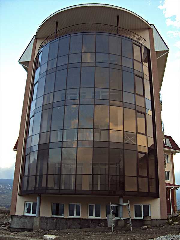 - разнообразие конструкций – современные технологии позволяют выполнить витражное остекление разных форм, в том числе – геометрически сложных, криволинейных, что придает здания привлекательный, нестандартный вид