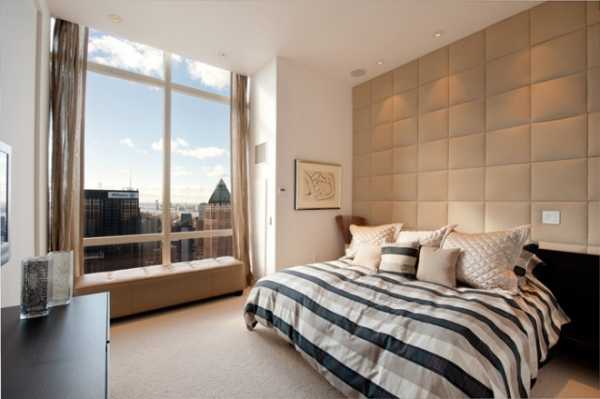 Популярное дизайнерское решение – панорамное остекление в спальне. Лучше всего кровать поставить напротив окна, которое обязательно оформить плотными шторами. Для этого подойдут и портьеры, и римские рулонные занавески.