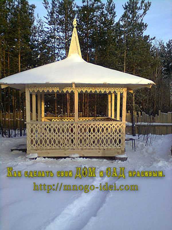 Такая красавица беседка установлена у Николая в Медвежьем краю. Внизу она обрамлена резными пилястрами, а вверху под крышей подзоры. Это все необходимо очень тщательно пропитать бесцветной пропиткой.