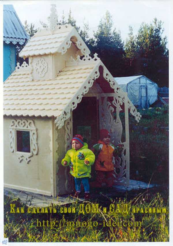 Вот такой превосходный детский домик Николай сделал на заказ. Только что изготовленный домик очень красив, но под воздействием осадков он потемнеет и поэтому крышу лучше покрыть ондулином.