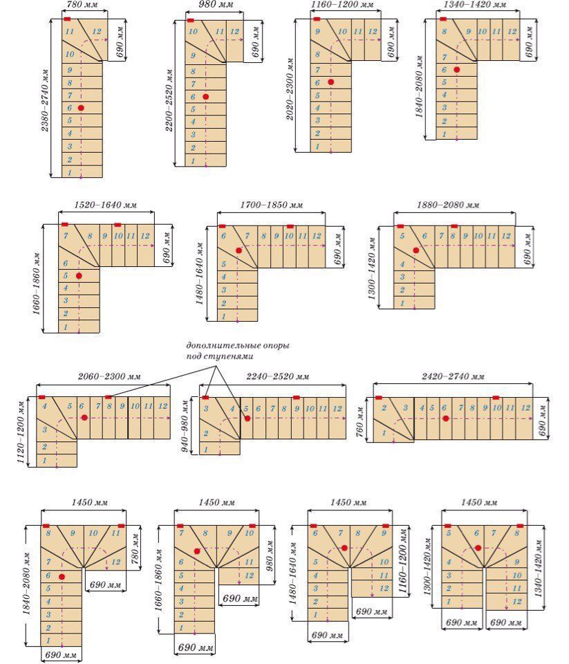 - Учитывайте ширину маршей и расстояния между ними, исходя из пожарной безопасности и удобства. Обычно для удобного подъема для одного человека нужен диапазон 90-120см,