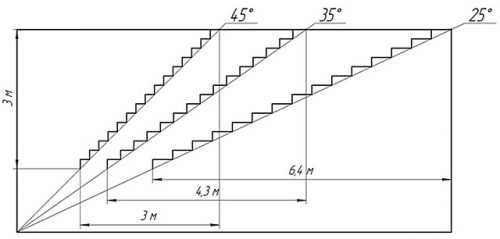 Зависимость между длиной лестницы и углом наклона.Соответственно, исходя из комфортного угла наклона, рассчитывается количество ступеней. Высота ступеней может варьироваться от 100 до 200 мм, а ширина не должна быть менее 200 мм и колеблется от 200 до 400 мм.