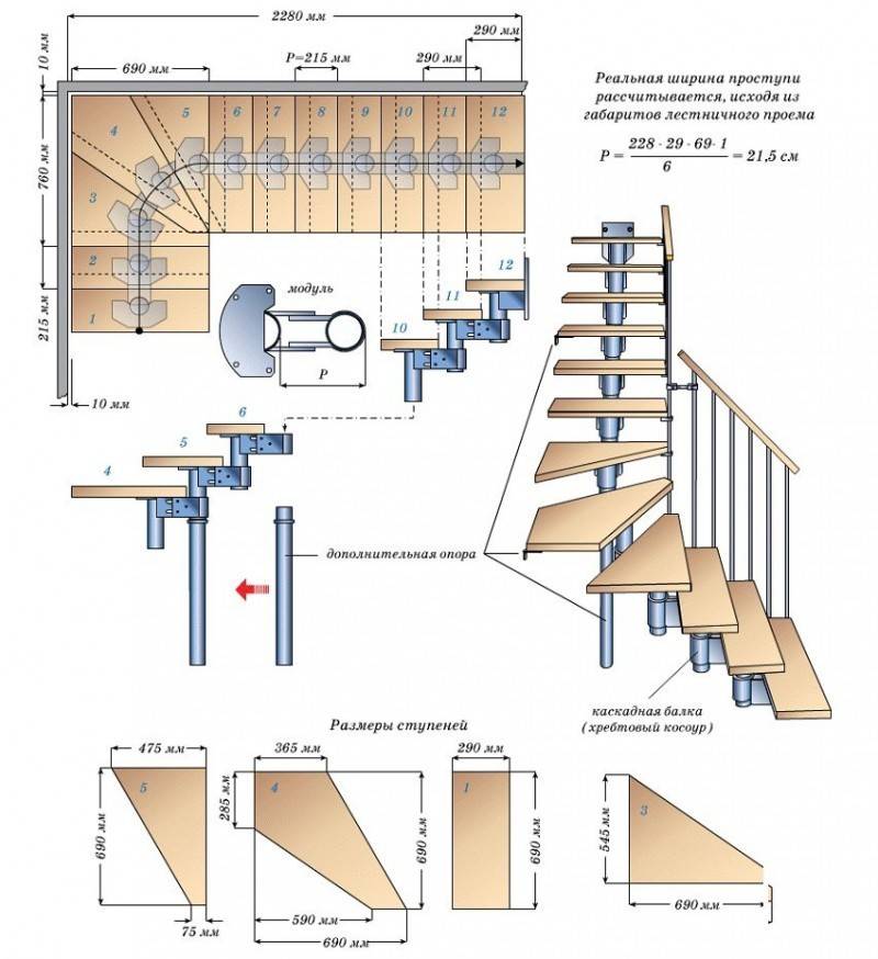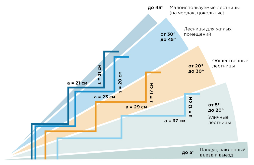 Виды лестниц, их углы наклона и размеры с учетом шага в 63 см