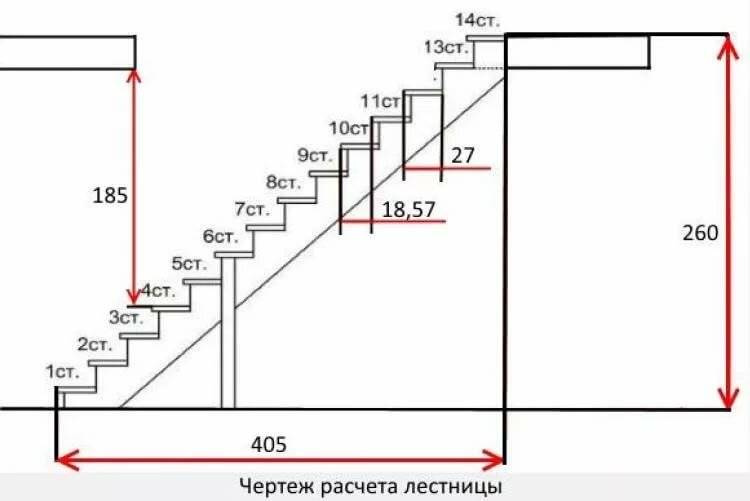 В расчет должны входить размеры перил, высота помещения, положение дверей.