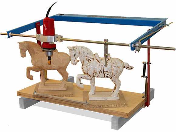 Еще проще объемное копирование происходит по барельефным моделям. При создании приспособления для него важно обеспечить плавное и свободное перемещение фрезера в трех плоскостях и жесткость связи от копира до кончика пальчиковой фрезы.