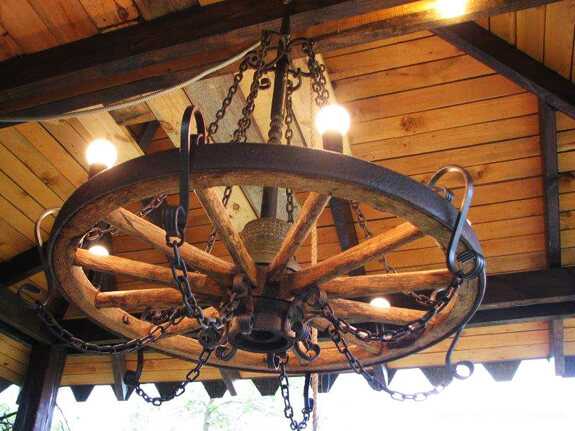 Если предпочитаете более простые способы, тогда самая обыкновенная люстра легко впишется. Только не забывайте о расстоянии до пола, и место установки – строго посредине беседки.