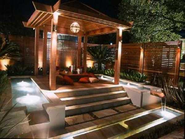Помимо удобства, свет может выполнять ещё и декоративную функцию. Беседки с подсветкой выглядят потрясающе не только на фотографиях, но и в реальной жизни (фото справа).