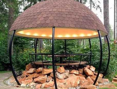 Стильное, продуманное освещение беседки позволяет повысить комфорт в вечернее и темное время суток. Выбор светильников, предлагаемых на рынке либо изготовленных собственными руками, дает возможность для реализации различных вариантов общей дизайнерской концепции.