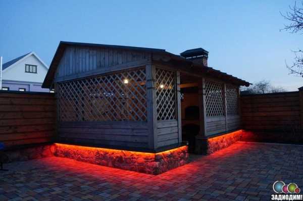 Способ можно назвать современным в освещение дачной беседки, более подробно об установке вы можете прочитать в статье, как установить светодиодную ленту на потолок. Такая подсветка создаст уютную обстановку, свет не будет бить в глаза, посмотрите освещение в беседке фото.